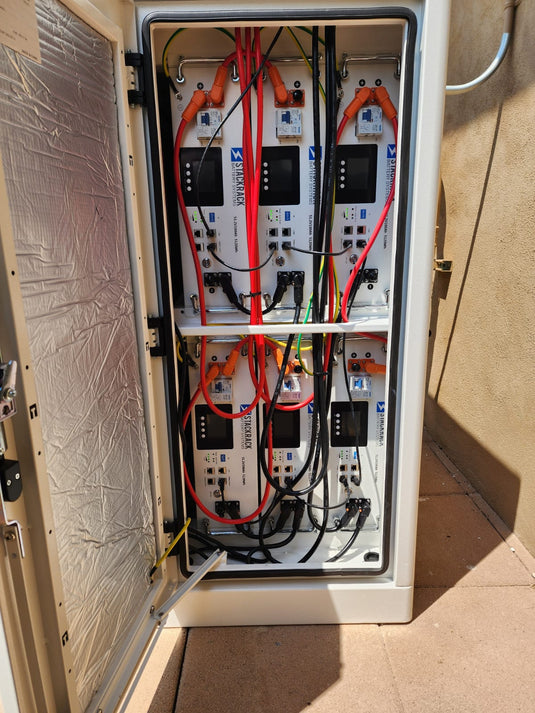 Less than 1 hour for most projects. The cabinet is pre-assembled except for the base legs, which take 5-10 minutes to install. Batteries can be installed from either the front or side doors and usually takes 2-3 minutes per battery.